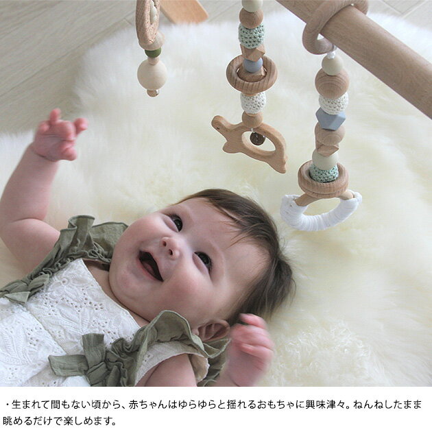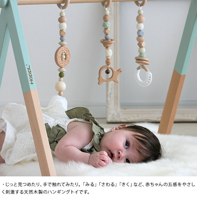 「みる」「さわる」「きく」など、赤ちゃんの五感をやさしく刺激する天然木製のハンギングトイです。