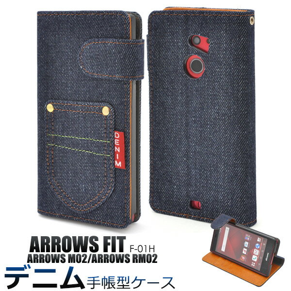 【送料無料】arrows Fit F-01H / arrows M02 / arrows RM02 用デニムデザインスタンドケースポーチ(ジーンズデザイン) ●液晶画面も保護する手帳型ケース!デニム生地のおしゃれな アローズフィット用ケース/ ドコモ スマホカバー 赤タグ docomo