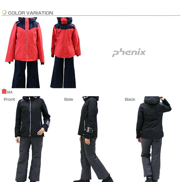 PHENIX フェニックス スキーウェア ■Bi-Color Snow Marble W's Two Piece PS8822P60 ●素材 <表> ・4-wayストレッチツイル2L(ポリエステル100%) ・スノーマーブルジャガード2L(ポリエステル100%) <裏> ・ポリエステルタフタ(ポリエステル100%) ・ブラッシュドトリコット(ポリエステル100%) <中わた> ・ダイジェナイトサーモ(ポリエステル94%、アクリル6%) ・ポリエステル ・ストレッチ性の高い素材とJQの素材コンビネーション ・ストレッチ性が高い、動きやすいパンツ 着丈/股下:65cm/73cm(M) MATERIALS ・DRY BARRIER 10000 ・DIGENITE THERMO ・4WAY STRETCH サイズ S M L XL